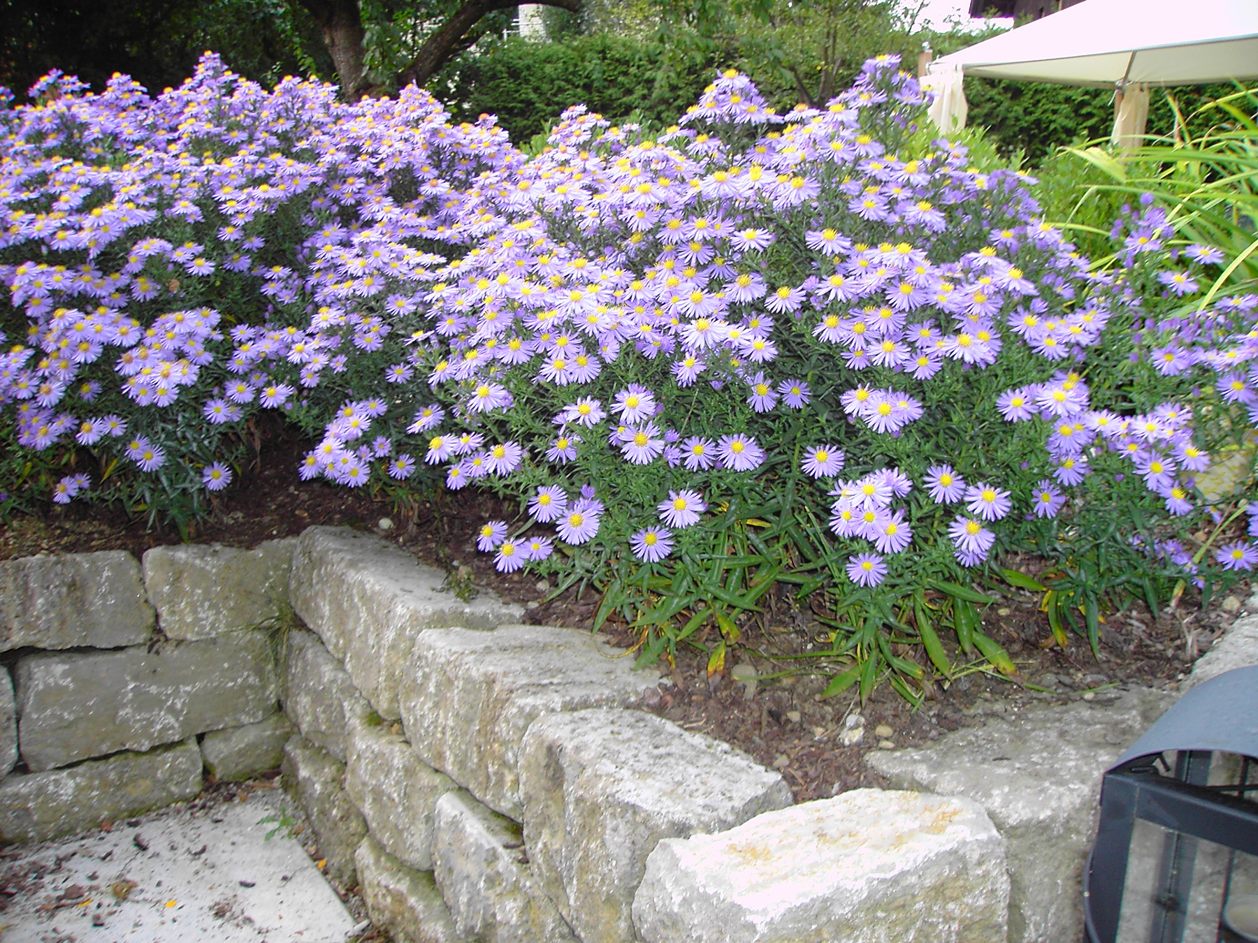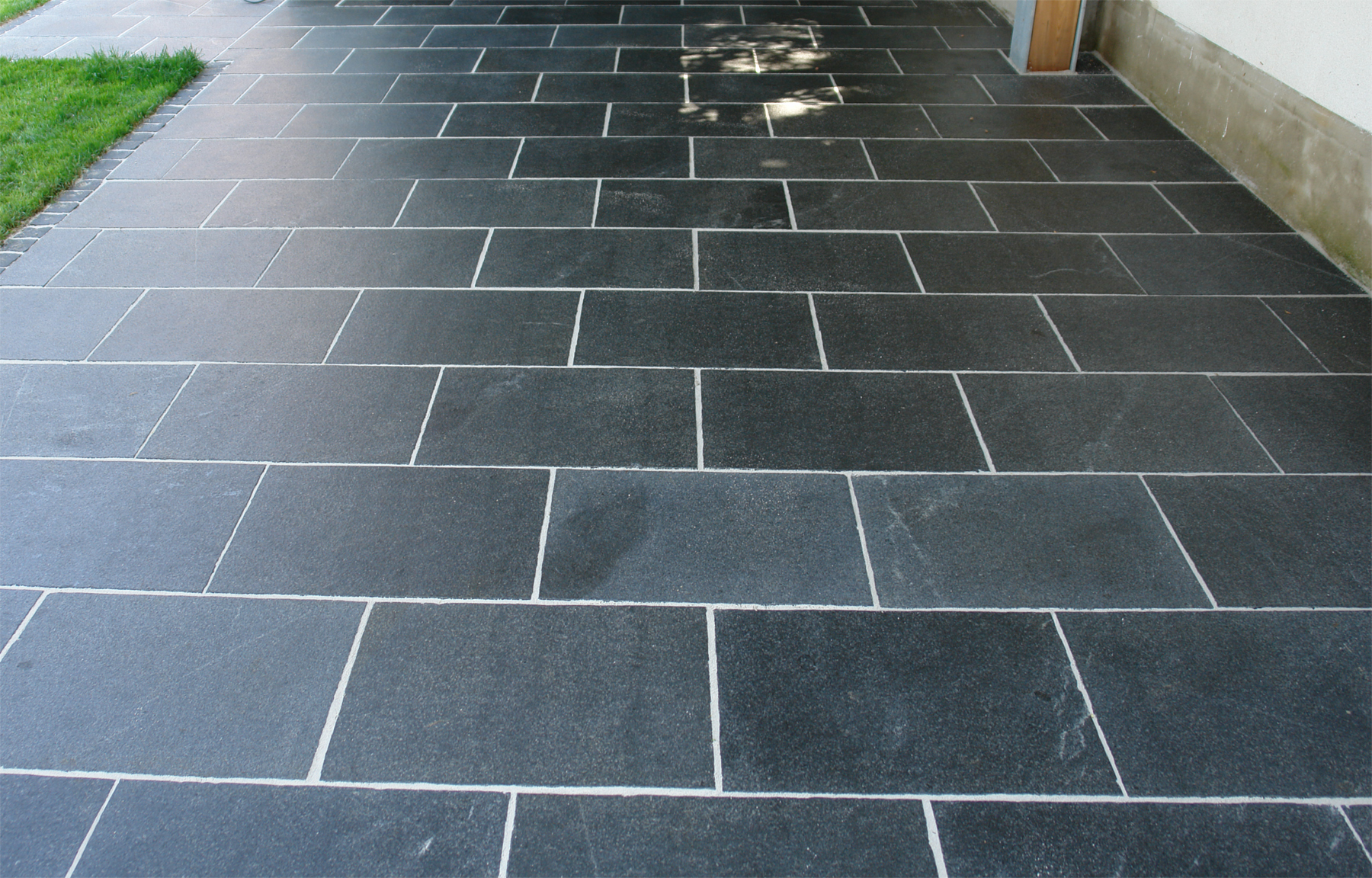 Terrassen in warmen T� (Sandsteinplatten)   Muschelkalkmauer trocken verbaut als Hochbeet f�benfrohe Staudenbepflanzungen.   Ebenfl�ige Garagenzufahrt aus Granitplatten "Chrystal Dark" in edlem Schwarz.